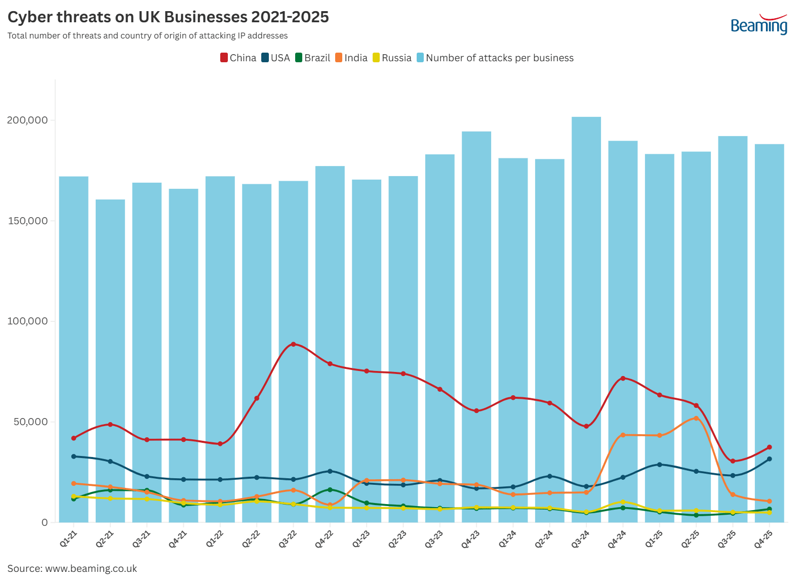 Cyber threats on UK Businesses by Q and Country of Origin 2020-2025